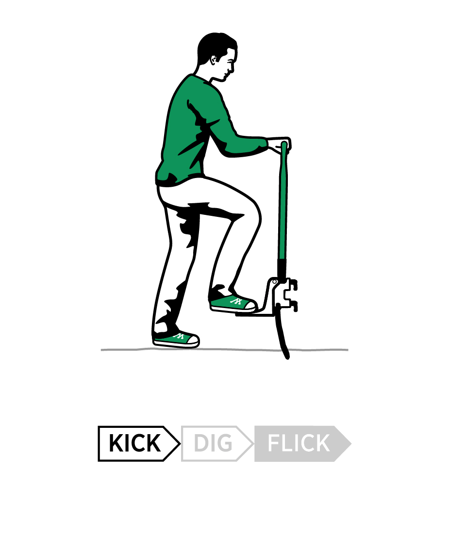 Kikka Digga は、受賞歴を誇るオリジナルの土起こしのサポートツールで、効果が高く評価されています。このツールには、独自のクランプ、ペダル、レバーアクション機能が組み込まれています。標準的なガーデンフォークやスコップに取り付けると、Kikka Digga が連動して掘削が加速し、姿勢の改善にも役立ちます。